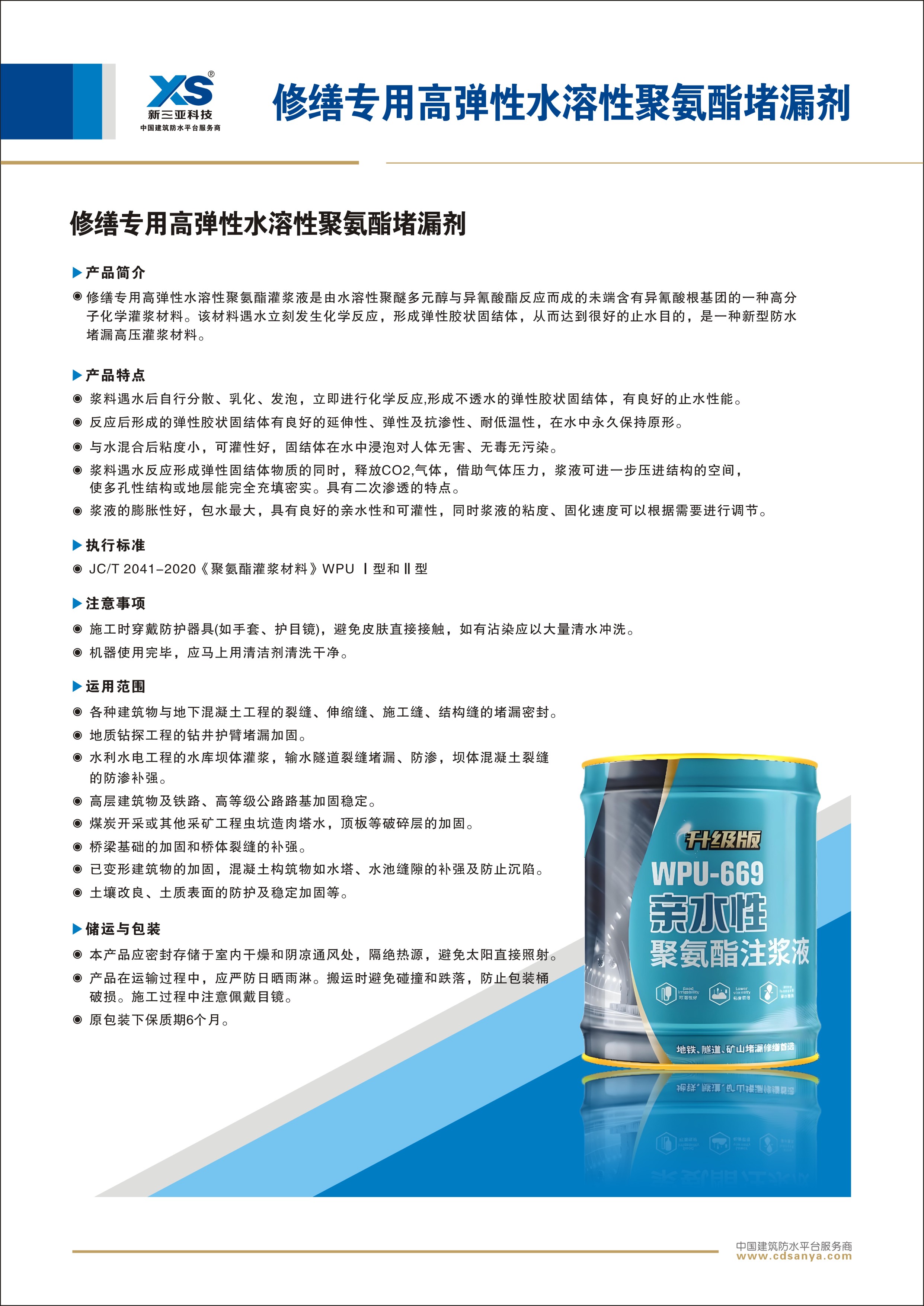 產(chǎn)品簡介: WPU-669水溶性聚氨酯灌漿液是由水溶性聚醚多元醇與異氰酸酯反應(yīng)而成的未端含有異氰酸根基團(tuán)的一種高分子化學(xué)灌漿材料。該材料遇水立刻發(fā)生化學(xué)反應(yīng),形成彈性膠狀固結(jié)體,從而達(dá)到很好的止水目的,是一種新型防水堵漏高壓灌漿材料。 規(guī)格型號: 按產(chǎn)品性能分為Ⅰ型和Ⅱ型 包裝: 7kg/桶 | ![]() |