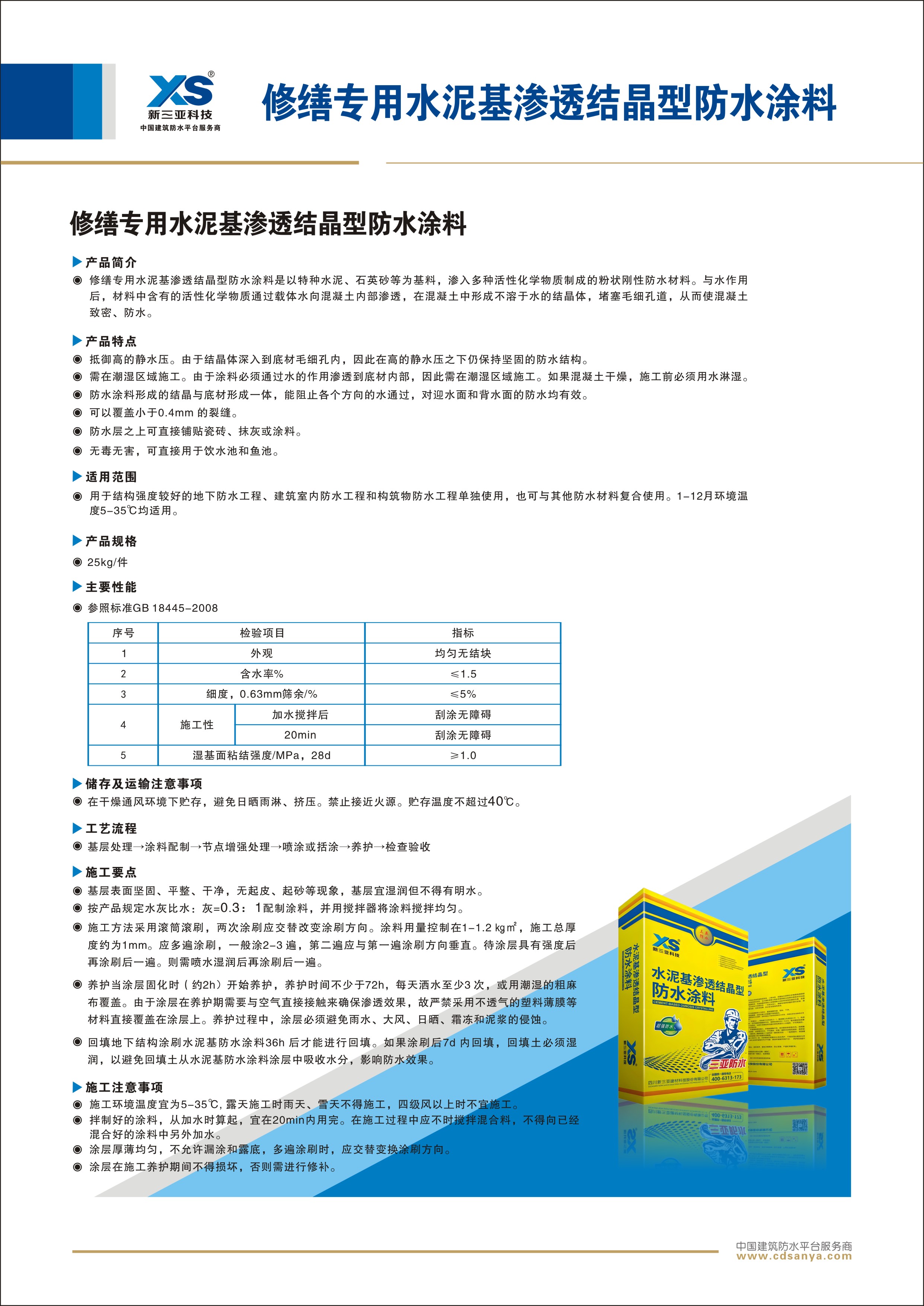 產(chǎn)品簡介: 修繕專用水泥基滲透結(jié)晶型防水涂料是以特種水泥、石英砂等為基料,滲入多種活性化學(xué)物質(zhì)制成的粉狀剛性防水材料。與水作用后,材料中含有的活性化學(xué)物質(zhì)通過載體水向混凝土內(nèi)部滲透,在混凝土中形成不溶于水的結(jié)晶體,堵塞毛細孔道,從而使混凝土致密、防水。 規(guī)格:25kg/袋 |